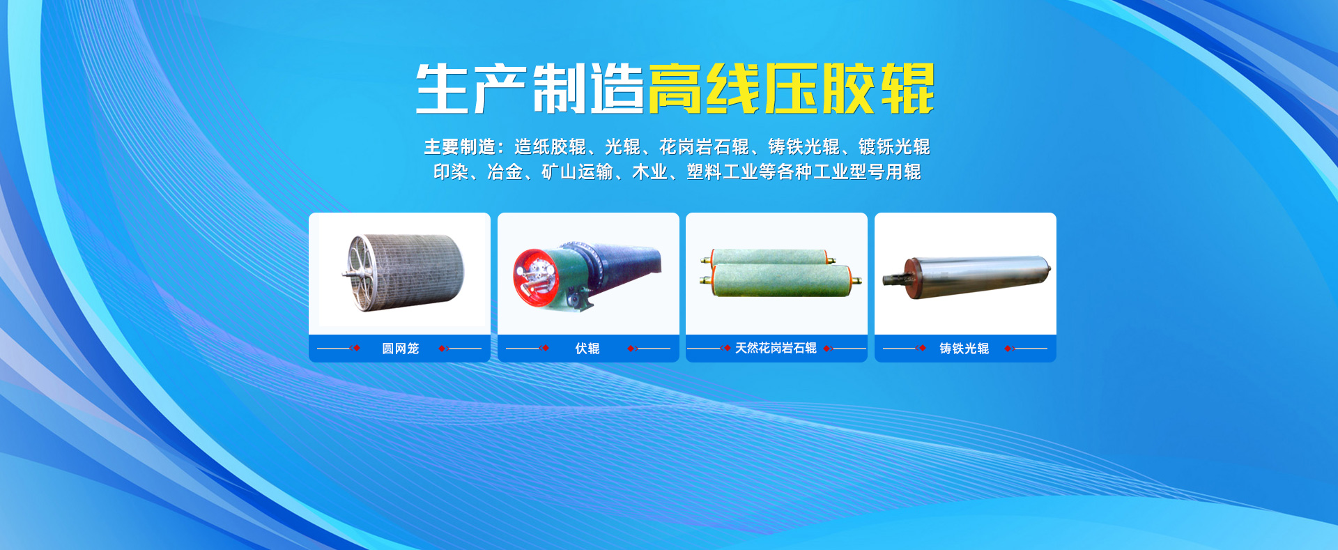 主要制造:造紙膠輥、光輥、花崗巖石輥、鑄鐵光輥、鍍鑠光輥、印染、冶金、礦山運輸、木業、塑料工業等各種工業型號用輥